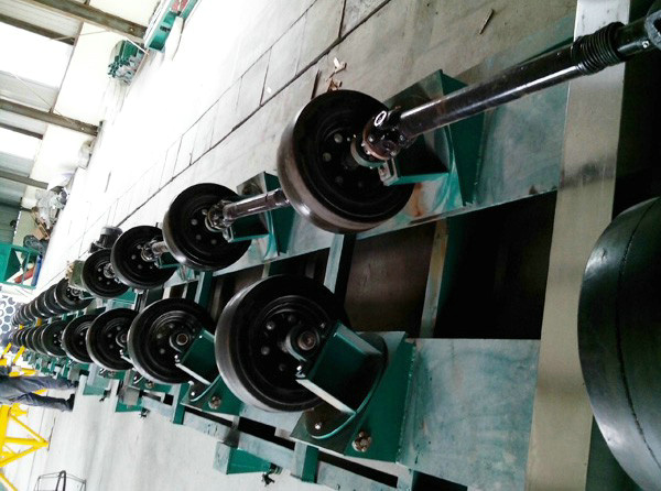 傳動線解決中大型管道進(jìn)行內(nèi)、外防腐作業(yè)時(shí)管子的進(jìn)給問題。它包括主動輪組件、從動輪組件、回轉(zhuǎn)盤、滑座、中心距調(diào)節(jié)機(jī)構(gòu)、中心距鎖止機(jī)構(gòu)、螺旋角調(diào)節(jié)機(jī)構(gòu)和螺旋角鎖止機(jī)構(gòu),所述主動輪組件和從動輪組件分別固定在對應(yīng)的回轉(zhuǎn)盤上,所述回轉(zhuǎn)盤安裝在滑座上,所述滑座與中心距調(diào)節(jié)機(jī)構(gòu)及中心距鎖止機(jī)構(gòu)配裝,所述螺旋角調(diào)節(jié)機(jī)構(gòu)與回轉(zhuǎn)盤配裝,所述螺旋角鎖止機(jī)構(gòu)安裝在滑座上,它與螺旋角調(diào)節(jié)機(jī)構(gòu)匹配。本實(shí)用新型不僅可降低操作人員的勞動強(qiáng)度、提高工作效率,而且能保證管道螺旋傳動線上各輪組之間參數(shù)的一致性。